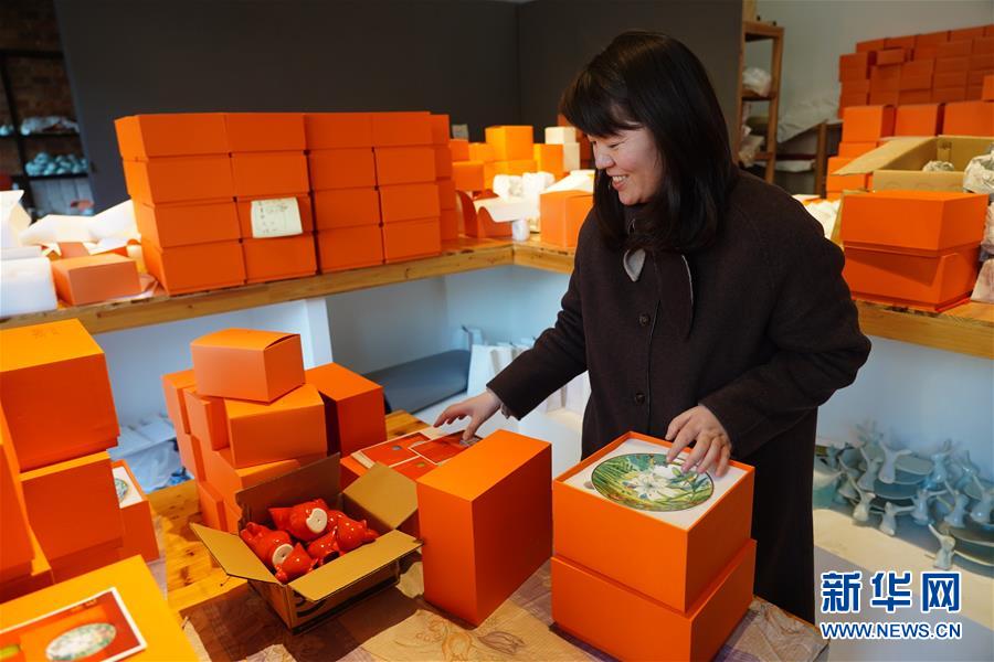 青年陶瓷艺术家吴安然在将自己的生肖鼠陶瓷产品打包寄出(1月8日摄)。