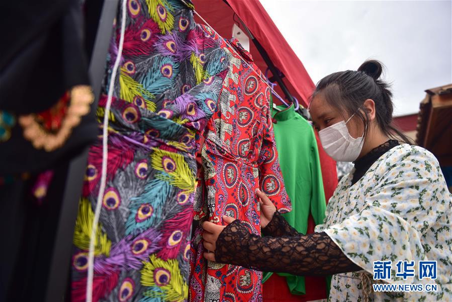 8月11日,尖扎县昂拉乡德吉村村民在自家经营的藏装店内整理服装。新华社记者张龙摄