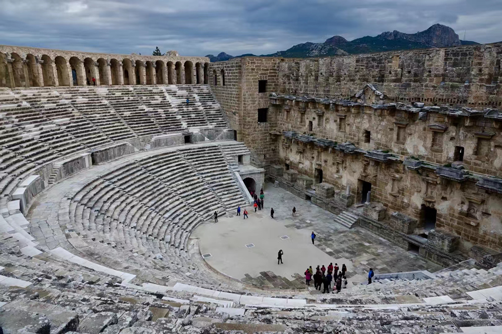 剧场有可容纳7000人的扇形石阶观众席,直径达96米,整齐规则的排列。李仁奇 摄