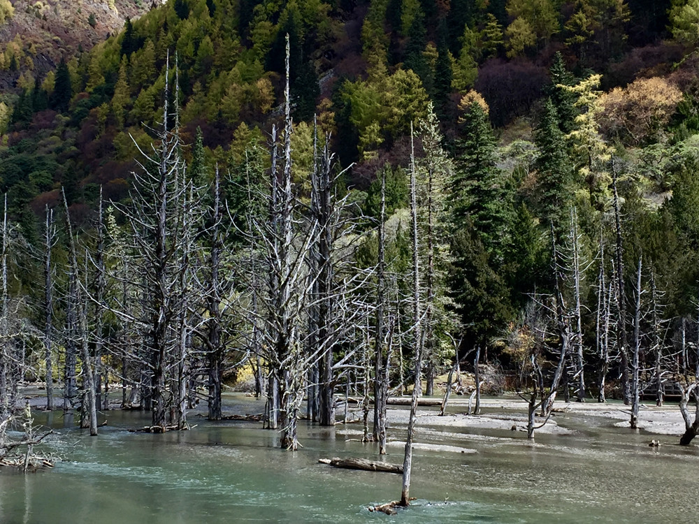 枯树滩,因地质灾害导致河流改道,淹没大片原始树木,杂木钙化后留下一片树桩置于河滩,故称“枯树滩”。李仁奇 摄