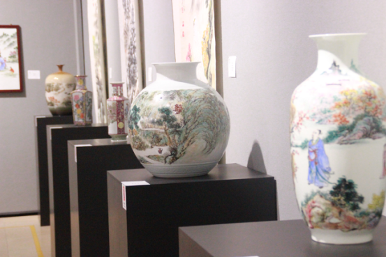 值得一提的是,刘致远除了展示山水、花鸟等画作,同时带来了多件精心创作的广彩陶瓷作品,各种花瓶、茶具、餐具上,有人物、风景以及动物等彩色绘图,虽为陶瓷摆设器具,却也和书画同样具备细意观赏的价值。