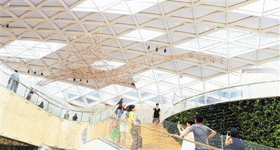 长20米,重300公斤,一件由40个部件构成的、形如飞鸟的大型装置作品悬挂在新近开业的华润万象天地穹顶。这是日本艺术家北山善夫为万象天地量身打造的艺术作品《无形》,特别值得一提的是,如此巨大的作品,是由艺术家用竹枝和纸,耗时数月纯手工制作完成。北山善夫说:“我生命的意义不在于作品本身,而是在制作这些作品的过程中。”