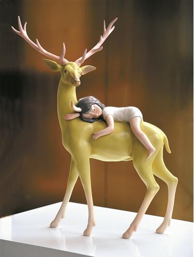 贾晓鸥的作品《悦悦》放在展厅中央格外引人注目:一位纯洁的天使少女,轻轻踮起脚尖,昂首闭目,拥抱自己,脸上洋溢着幸福的甜美和自信的笑容,给人们带来无限的想象力。贾晓鸥在现场分享了悦悦的设计理念:以天使少女为形象的悦悦代表着喜悦,包含着童话的美感,又携带着对未来的憧憬与希冀。白色调代表着小女孩独有的纯真、善良与纯粹,让人在无论何时观赏都能感受到安静与优雅。干净利落的短发,在梦幻的氛围中凸显出少女的蓬勃朝气与幸福甜美。