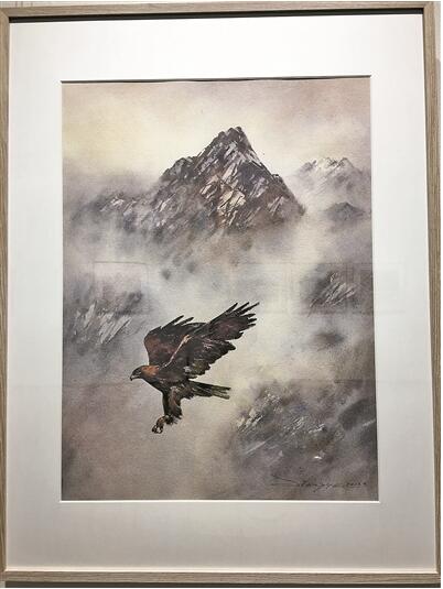 雄鹰展翅翱翔、盘旋于海湾、高山的上空,这是蒋烨教授水彩画中的场景。概括凝练的风景,气度非凡的飞鹰,一动一静间把融合中国传统文化的现代水彩语境表现得酣畅淋漓。开幕当天,蒋烨将画作《海·鹰》赠送给了龙岗区人民政府。