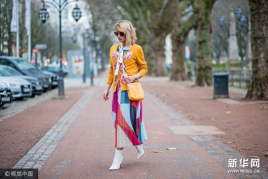 近日,德国杜塞尔多夫,时尚博主Gitta Banko街拍。她戴Miu Miu茶色墨镜,身穿Steffen Schraut橘色亮片拼贴针织开衫,内搭Steffen Schraut白色蝴蝶印花系带雪纺衬衫,Steffen Schraut拼色百褶纱裙,肩背Volker Lang橘色口金包,脚踩Kurt Geiger白色尖头高跟短靴。