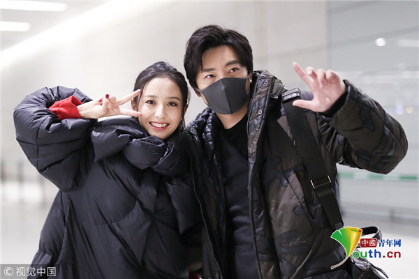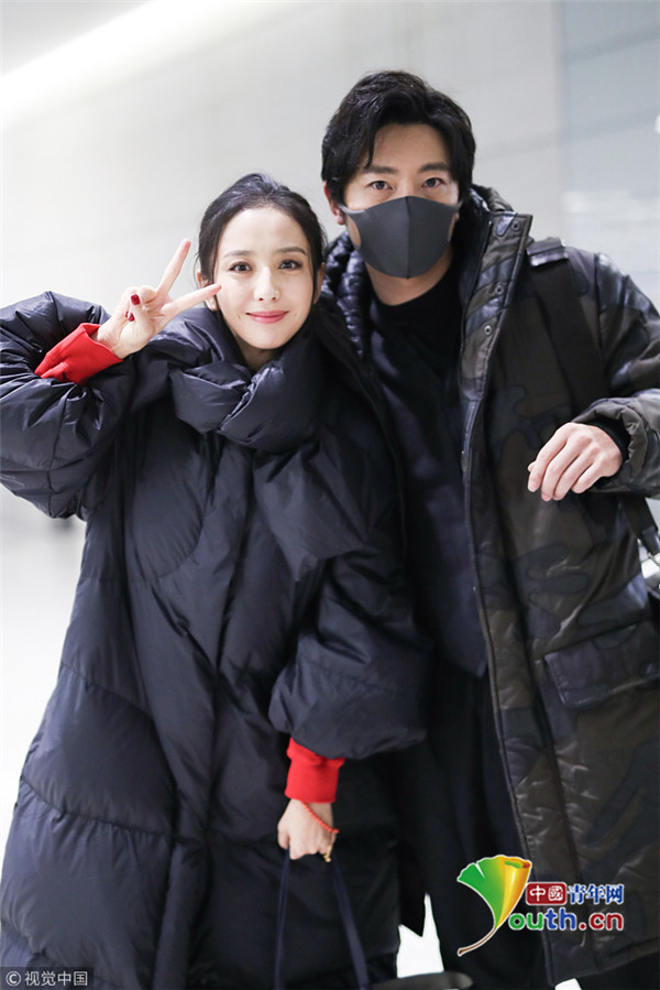 佟丽娅郭京飞卖萌合影 个性羽绒服俏皮减龄
