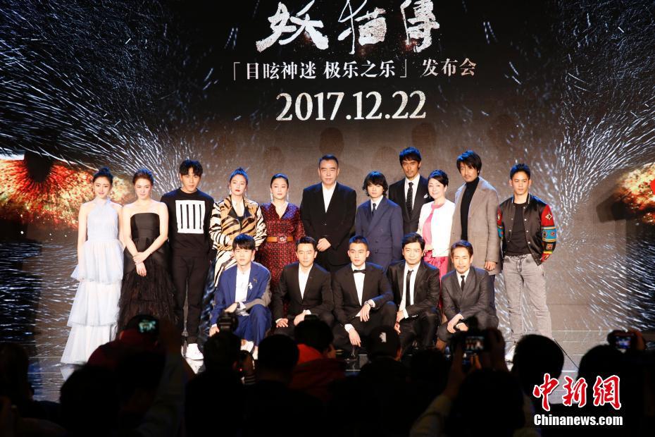 12月17日,由陈凯歌导演的贺岁奇幻题材电影《妖猫传》在北京举行全球首映发布会,导演陈凯歌,制片人陈红携主演黄轩、染谷将太、张雨绮、秦昊、张榕容、张鲁一、刘昊然、阿部宽、松坂庆子等亮相。影片改编自日本作家梦枕貘的魔幻系列小说《沙门空海》,将于22日起在中国内地上映。图为众主创合影。