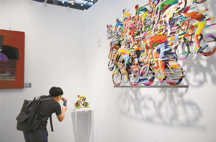 参展商“誉美国际”的展台外墙上,一场疾驰中的跑马比赛正酣。将不锈钢板切片组合,饰以热情而愉悦的色彩,这两组风格极具个性化的墙面雕塑作品,均来自以色列国宝级艺术家大卫·格斯坦,引得不少观众驻足欣赏。