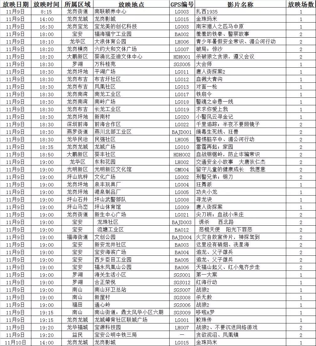 【深圳市万场电影惠百姓】今晚11月9日(星期五)露天免费放映电影安排