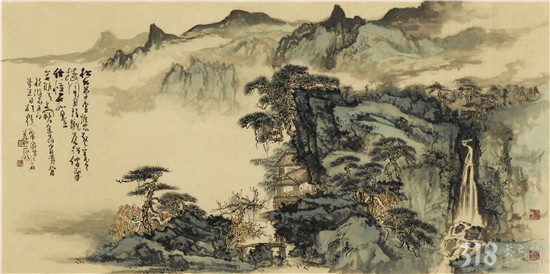 范阳先生的山水画,笔法近取傅抱石、黄秋园,远溯“元四家”中黄公望、王蒙。筑居杨岐山下,使先生日夜亲近自然山水,吐纳天地,养浩然之气。“外师造化,中得心源”,唐代张璪一言道破了山水画家修养、悟性的不二法门。范阳先生正是以自然(造化)为营养,入而为心灵化育,镕冶成亦古亦新,远离尘俗的独特风格。近作《松风泉声》(五屏联)气势磅礴,大开大合,细究又十分谨严。笔墨与丘壑融为一体,既豪放又稳健。浅绛青绿的设色,使画面有葱翠欲滴之感。堪称山水画中的经典。