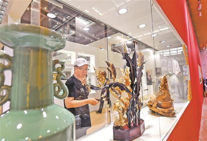 在9号馆的5592平方米的场地上,精致的生活器具、体量庞大的玉雕、惟妙惟肖的根雕以及各式各样的艺术精品都在讲述着背后的匠人故事。