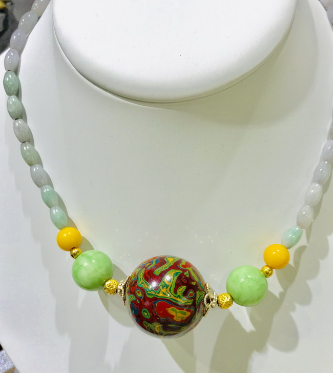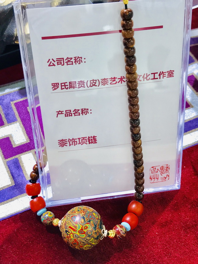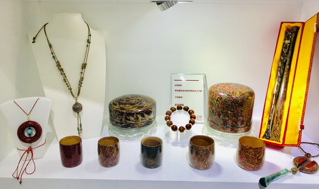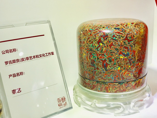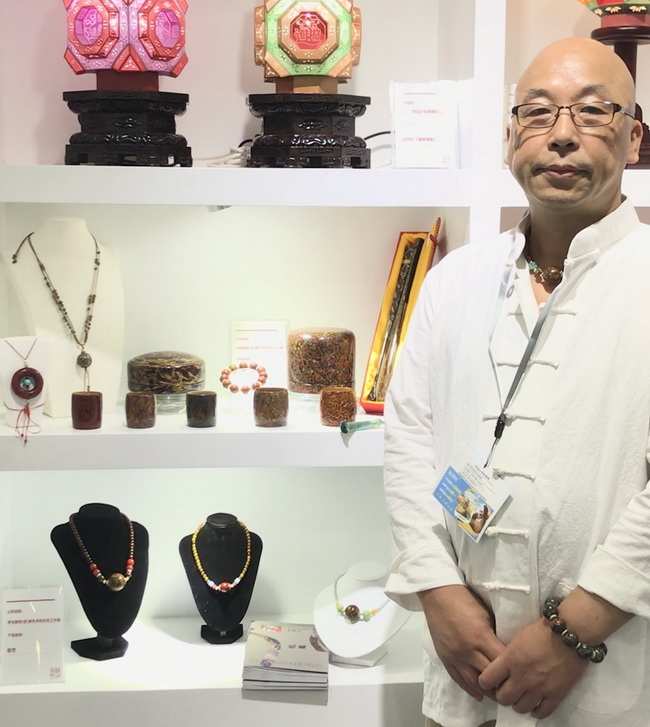 浙江省组团的展位在会展中心2号馆,规模不小,罗献兵老师的漆艺作品都比较精致,但展位却比较舒展。一眼望去,五彩斑斓的漆艺作品令人眼花缭乱,精神为之一震,主要作品有犀皮漆扇、印盒、糖果盒、竹胎茶杯、腰坠以及手串和漆珠等。前来参观的人不少,但从他们的言谈中得知了解的并不多,多为其绚丽的光彩所吸引。