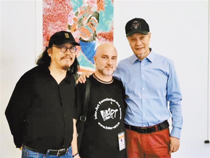 樊鸿宾(右)、邹明(左)在画展上与当地艺术家合影。(主办方供图)