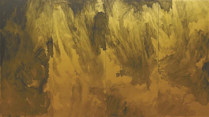 此次展出的作品《山外之山中》泥金四条屏令人耳目一新。他借助屏风的形式,使用泥金这一材料,以大开大阖的磅礴气势,展现了苏轼笔下“不识庐山真面目,只缘身在此山中”的意境。