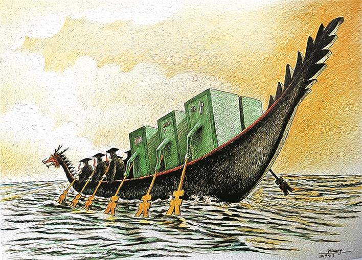 上榜漫画家邓微观系深圳市宝安区打铁文艺社社长,其《感物系列》以见物兴感为主线,展开丰富的想象力,用动物拟人的方式幽默诙谐地抒发人生感悟,让人会心一笑之余引起共鸣,令观众感叹艺术家的漫无边际的“脑洞”。对于作品首次入选国内美术界规格最高的国展,邓微观很兴奋:“这是对我这个系列作品的高度肯定。”《感物系列》系列作品源于他闲逛发呆时的想象碎片,将这个碎片贯穿就成了这个系列作品。邓微观在茶余饭后经常到铁岗的西乡河边散步,河中不时传来低频厚实的“男低音”引起他的注意,此起彼伏,听来如交响曲一般通达舒畅。他循声寻觅,原来是蛤蟆的声音,只见这些“音乐家”在下水道洞口,在草丛中,河道缝中快乐地欢唱……这些天生的乐观者给邓微观带来美妙的心情,所以创作了这幅《天生乐观》。再如《三餐之余》,有时饭后经常会在茶几前发发呆,思考人生不应该只是面包和苹果,还应有点别的……