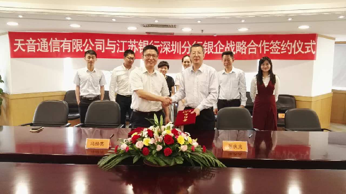 近日,江苏银行深圳分行与天音通信有限公司签签署了银企战略合作协议,以深化双方合作为主旨,稳固战略合作伙伴关系,以期形成银企良好互动,共谋业务发展。天音通信有限公司成立于1996年,一直从事手机购销业务,该公司销售量及营业额均位居深圳第一、全国第二。