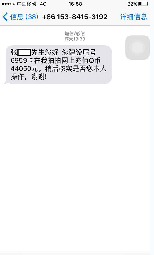 一天,客户张先生收到一条手机号码为15384153192发来的短信:“张先生您好∶您建设银行尾号6959卡在我拍拍网上充值Q币44050元,稍后核实是否您本人操作,谢谢!”起初,张先生见是陌生手机号发来的短信,就并未在意,可随后却收到建行95533客服中心发来的短信提醒,称他的银行账户发生了一笔44050元的转账支取业务。