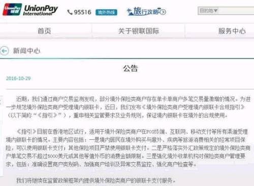 10月29日,银联国际发出正式声明,表示这是重申之前的规定。“近期,我们通过商户交易监测发现,部分境外保险类商户存在单卡单商户多笔交易量激增的情况。为进一步规范境外保险类商户受理境内银联卡,近日,我们发布《境外保险类商户受理境内银联卡合规指引》(下称《指引》),重申相关监管要求及业务规则,保证境内银联卡在境外的合规使用。我们将继续在监管政策框架内提供境外保险类商户的银联卡支付服务。”