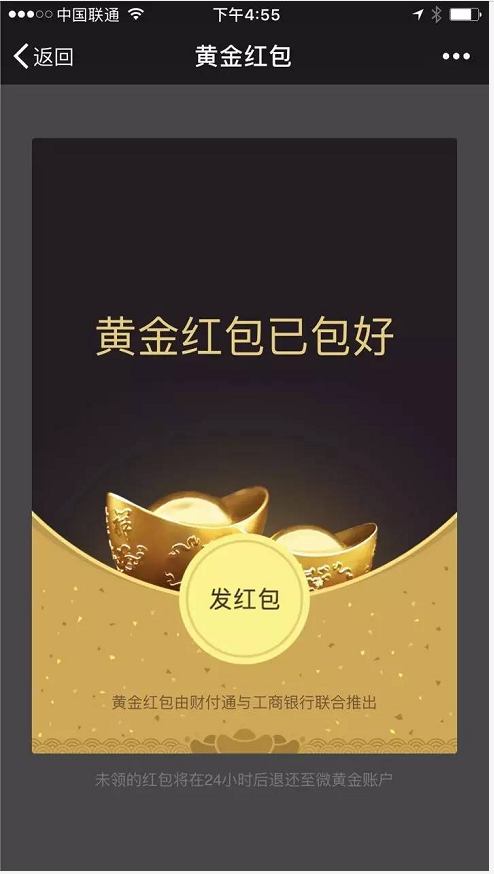 如果黄金红包包好后未发送或未被领取,24小时后会自动退回到发送用户微黄金账户