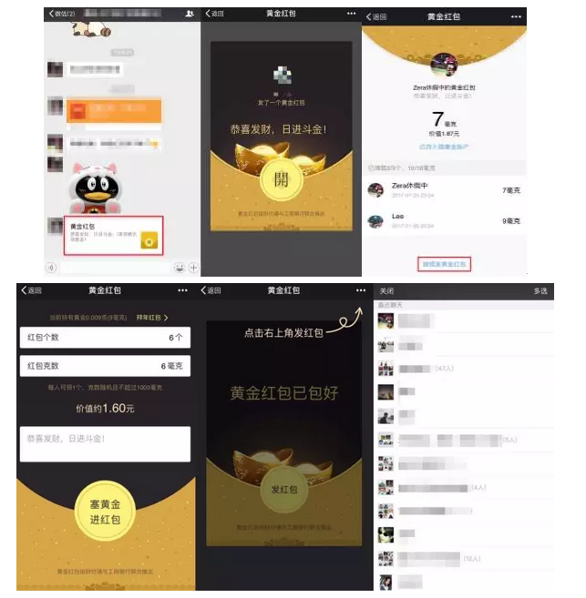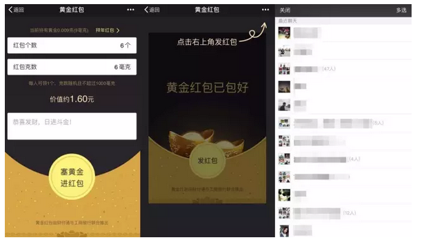 我们也可以在微信群里发红包,基于风险控制及消费者权益保护的相关要求,“黄金红包”采取了一个不超过1克的限制。