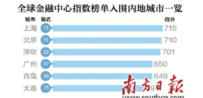 中国内地有上海、北京、深圳、广州、青岛、大连六个城市进入榜单。其中,上海715分,全球排名第13,较上一期排名上升3位;深圳701分,全球排名第22,与上期保持不变;广州首次进入全球金融中心指数体系,表现不俗,评分达到650分,全球排名第37;青岛紧随其后,评分达到649分,全球排名第38,较上期排名上升8位。