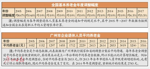 按照国家和省的部署,广州市企业退休人员养老金水平也逐年提高,平均养老金水平由2005年的1052元提高到2016年的3316元。记者了解到,广州自1998年以来每年都调高养老金水平,以往按一定比例调整,2006年起按照国家和省的规定,从定比调整改为定额调整,后按照国家和省的规定,采取定比和定额相结合的办法。