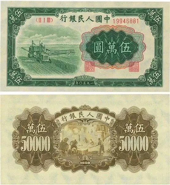 “伍万元收割机”由上海印钞厂承印,同样印刷于1950年,发行1953年,流通时间仅1年4个月。第一套人民币和现在人民币的折合比例为10000:1,即当时的50000元相当于我们现在的5元钱,在当时相当于一个家庭半个月的生活费用。