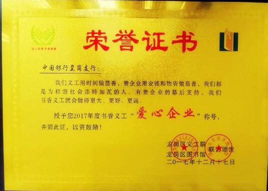 深圳新闻网讯 近日,深圳市龙岗区义工联、龙岗图书馆书香义工2017年度总结大会在龙岗区文体中心召开。大会授予中国银行深圳皇岗支行书香义工“爱心企业”称号,并联合颁发荣誉证书。