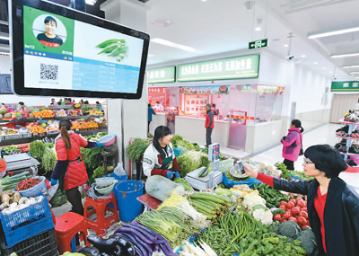 2017年11月29日,在安徽合肥瑶海区胜利智能农贸市场,市民在扫码支付。