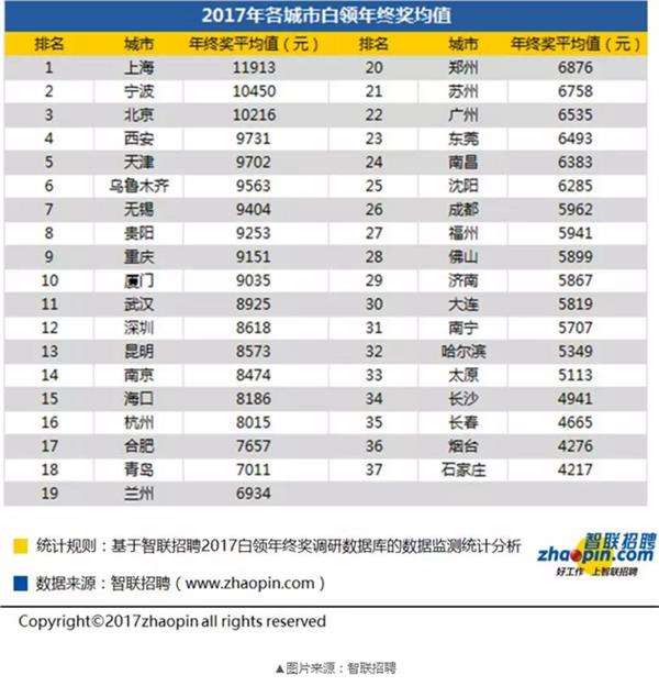 分城市看,上海夺去了北京去年第一的地位,但宁波才是最大的赢家。宁波白领的年终奖金不仅甩开了省会城市杭州,甚至还超过了首都北京,以10450元位于全国第二。
