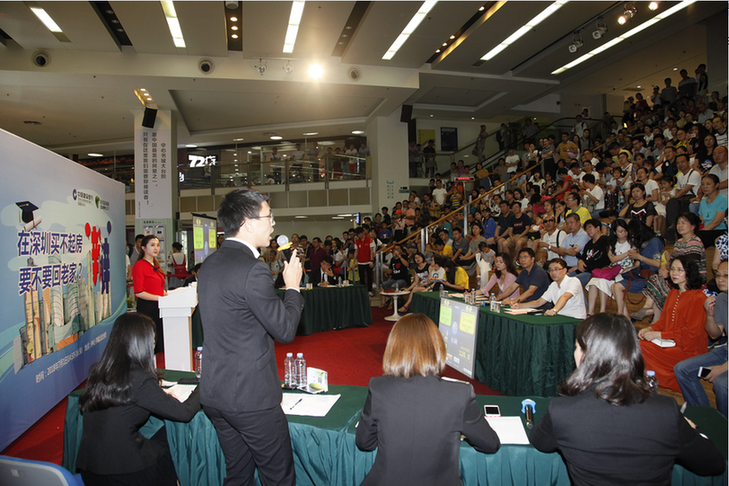 深圳新闻网讯 江湖有传言,“一线城市容不下肉身,三线城市装不下灵魂。”一线城市高企的房价是造成这种身体和灵魂错位的主要原因。 “逃离还是留下?”不断拷问着还没有在深圳安家的人们,也拷问着即将毕业的大学生们。为对这一引起广泛关注的话题进行深入讨论,7月1日,建行深圳市分行联合深圳新闻网在中心书城举办了一场以“在深圳买不起房,要不要回老家?”为主题的辩论赛。比赛引起了市民的极大共鸣,现场人气爆棚。