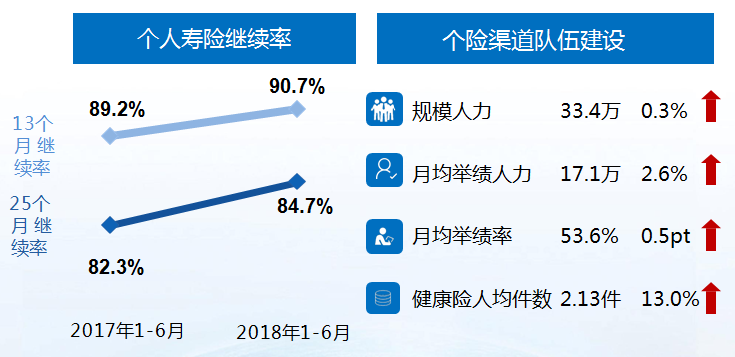 继续率方面,随着健康险为核心的保障型业务深入发展,新华保险持续强化管理,个人寿险业务13个月和25个月继续率达到90.7%和84.7%,较去年同期分别提升1.5和2.4个百分点,整体业务品质得到改善。队伍方面,截至2018年6月30日,新华保险共拥有33.4万名个险营销人员,月均举绩人力17.1万人,同比增长2.6%;月均举绩率53.6%,同比提升0.5个百分点;健康险人均件数2.13件,同比增长13.0%。