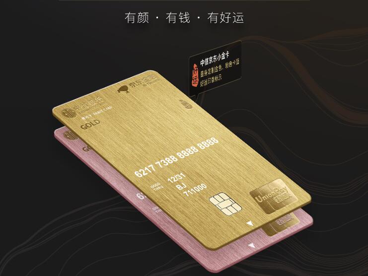 中信银行京东小金卡按照中信银行贵宾客户身份的规格定制和设计,颜色分金色和玫瑰金两种,卡面为符合时尚潮流的竖版设计,简约大方、典雅别致,卡面右上方还有一个灵动的中国印,内嵌“好运”二字。