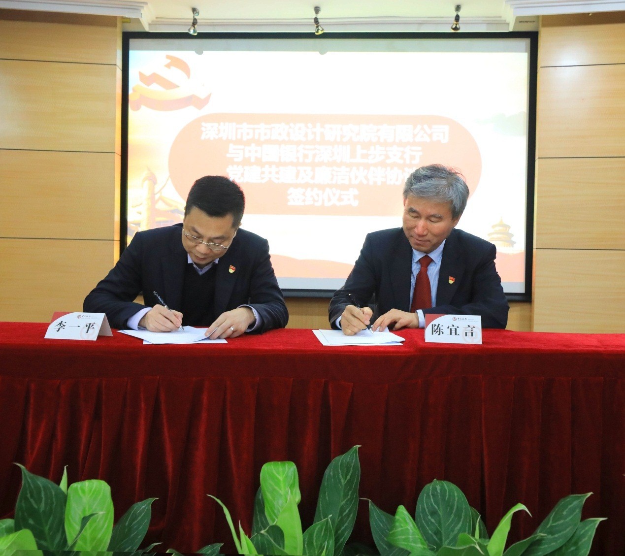 演讲结束后,李一平和陈宜言分别代表中国银行深圳上步管辖支行党委和深圳市市政设计研究院有限公司党委签署了党建共建和廉洁伙伴合作协议。