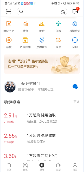 •基金频道:专门打造的基金平台,帮助你智能化的自助选基,找到最合适的产品。多维度的首发专区、聪明定投、五星基金、货基专区等特色基金服务,国内首个智能投顾产品“摩羯智投”,总有一款适合你。新手不懂也没关系,招行帮你把控选购全程,在严控风险的前提下,助你实现稳健收益。
