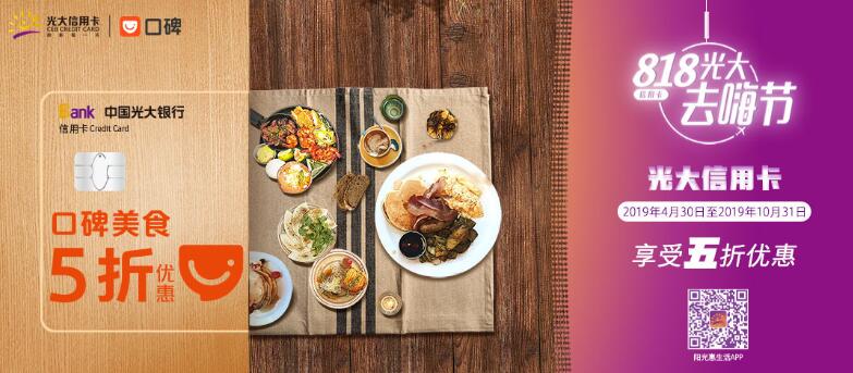活动三:2019年6月1日-2019年8月31日,每周五、周六、周日10:00至24:00点整活动期间支付宝实名认证个人用户在口碑指定商圈,用户使用支付宝账户绑定光大银行信用卡,通过口碑手机客户端或支付宝-口碑页面购买线上商圈通用券,或进行当面付支付消费,可有机会享受5折优惠,最高封顶优惠50元,活动期间每天限20000个优惠名额,用完即止。活动期间同一用户每天限享1次优惠,同一用户每月最多可享受2次优惠。