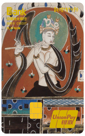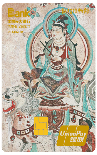 光大敦煌联名信用卡卡面设计取材于敦煌壁画,有敦煌大智文殊白金卡、敦煌天宫伎乐白金卡以及敦煌五百强盗成佛菁英白金卡三种信用卡。光大敦煌联名信用卡的卡面设计灵感均来源于敦煌壁画,大智文殊白金卡画面为文殊菩萨结跏坐于青面狮虬首仙狮背上。文殊菩萨是专司智德、辩才第一的大菩萨,尊号“大智文殊”。天宫伎乐白金卡主体画面为伎乐天,取材于莫高窟288窟,营造了佛陀讲经说法时佛国世界欢乐祥和的氛围。五百强盗成佛菁英白金卡卡面设计取自“五百强盗成佛”的壁画故事,佛用神通使被剜去双眼的强盗重见光明,并对他们进行点化,五百强盗潜心苦修终成五百罗汉。光大敦煌联名信用卡的卡面设计将传统文化融入现代金融产品,极具敦煌文化的风格。
