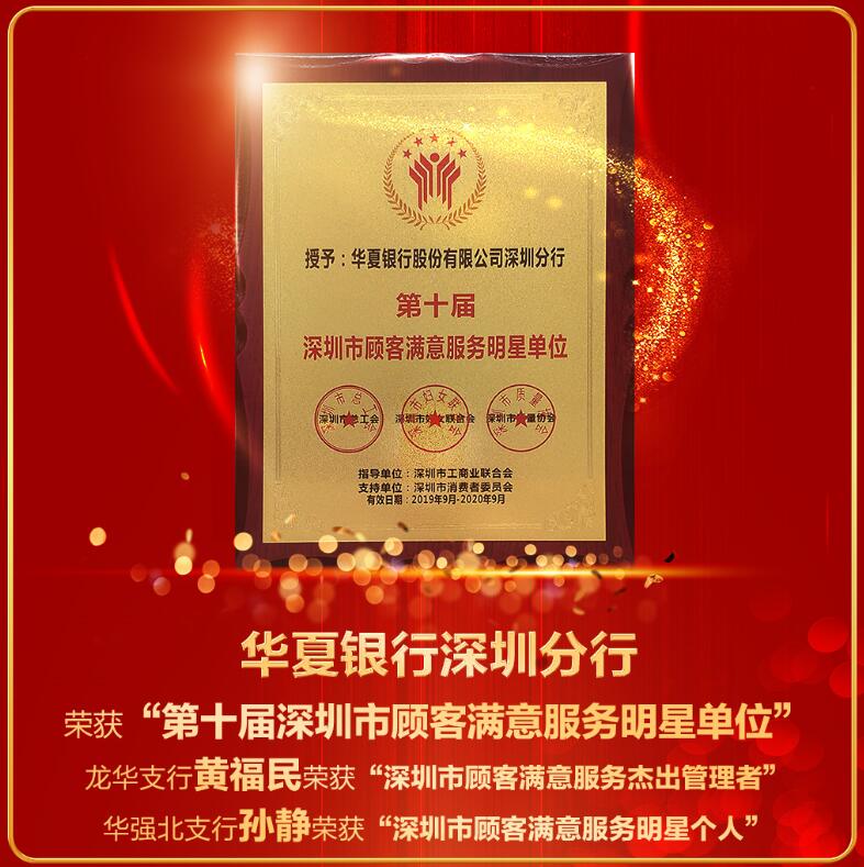 深圳新闻网讯 近日,华夏银行深圳分行在“第十届深圳市顾客满意服务明星”暨“第二届深圳市优质服务示范单位”评选活动中,荣登“深圳市顾客满意服务明星单位”榜首,“华夏服务”品牌影响力再次得到行业和客户的高度认可。同时,该行龙华支行行长黄福民、华强北支行副行长孙静分别获得“深圳市顾客满意服务杰出管理者”和“深圳市顾客满意服务明星”荣誉称号。