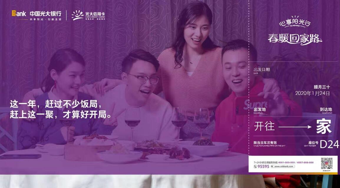 此次“春暖回家路”活动将在全国多地同步开展,围绕餐饮、出行、娱乐等多种春节期间关键场景,光大信用卡推出十余个优惠活动,包括国内机票优惠立减、旅游线路优惠立减、10元购50元饭票、18元购50元滴滴专车权益包、口碑优惠满减、口碑APP满额减等。活动重点从“回家路途”延伸到“回到家后”,涵盖团圆、走亲访友等各类场景,其中针对年夜饭场景特别推出新春主题榜单、藏宝小镇兑红包、餐饮主题快闪店三大核心玩法。此外,2020年是全面建成小康社会的决胜之年,“拥军爱国送温暖”等公益行动同步开展,让“关爱”“正能量”成为2020年春节的关键词。