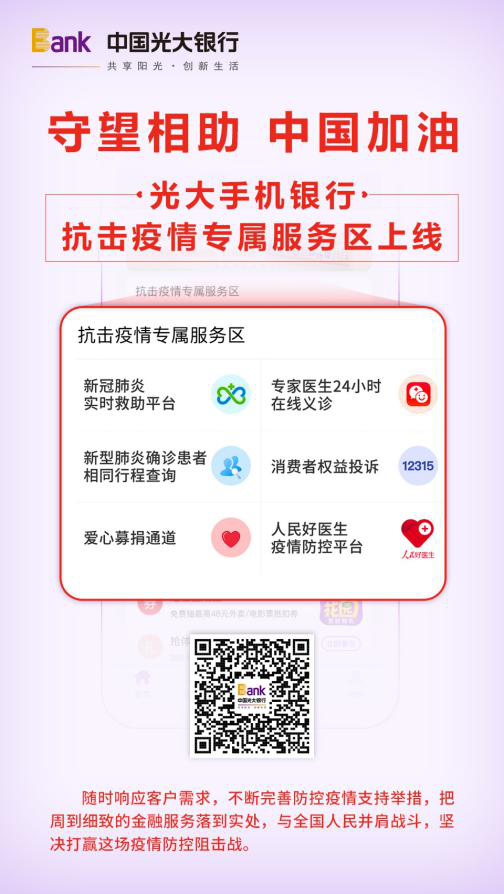其中,专家医生24小时在线义诊是由光大银行与平安好医生APP合作推出,可在线免费提供专家医生义诊服务,并提供多类常见药物的购买服务;新冠肺炎实时救助平台是由光大银行与微医互联网总医院联合上线,平台可提供最新疫情动态、疫情防御、7*24小时在线免费专业医生咨询等功能;爱心募捐通道提供多个渠道的赈灾捐款项目,让爱心汇聚防控疫情斗争第一线;人民好医生疫情防控中央平台第一时间科普权威知识,公布疫情防护物资供需发布;确诊患者相同行程查询功能可为客户提供火车车次、飞机航班号、城市等方式,查看是否有肺炎患者同行。