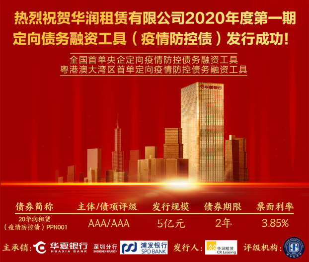 深圳新闻网2月29日讯 2月28日,由华夏银行深圳分行主承销的华润租赁有限公司2020年度第一期定向债务融资工具(疫情防控债)成功发行,该债券是全国首单央企疫情防控定向债务融资工具,也是粤港澳大湾区首单疫情防控定向债务融资工具。
