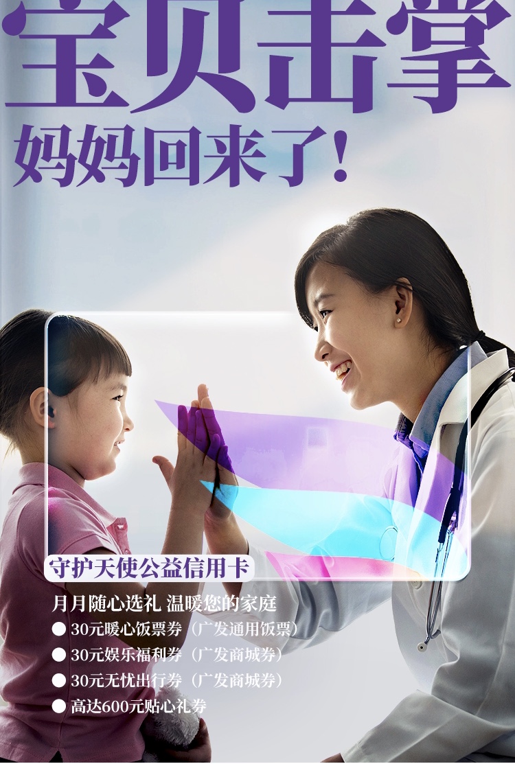 脱下白大褂,医护人员也是一群爱生活爱家庭的人,也喜欢逛淘宝、追剧、和朋友吃吃喝喝享受生活。广发守护天使公益联名卡将服务延伸到医护群体的日常生活,为持卡人提供5倍积分、月月消费礼券、高端出行服务等丰富的权益。