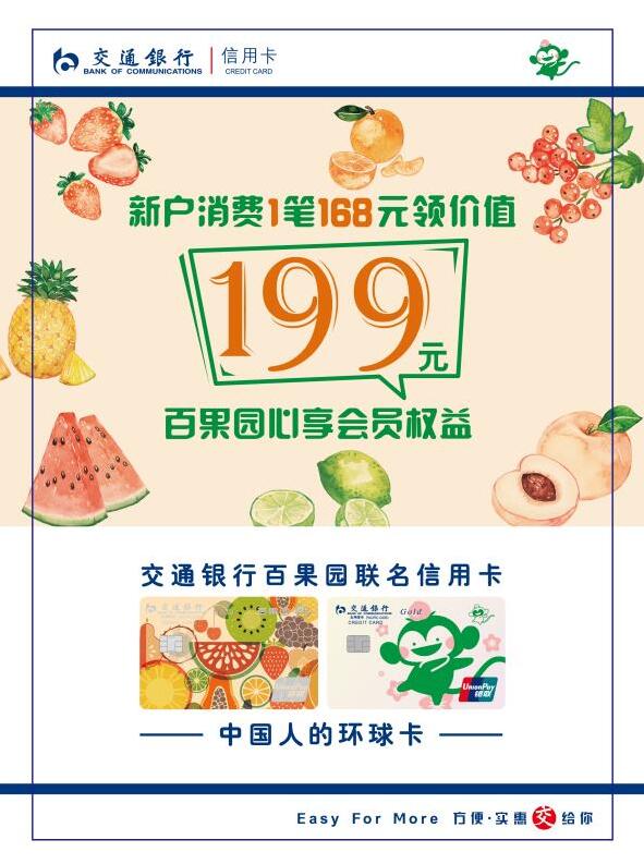 这款卡片不仅卡面超可爱,有五彩缤纷的水果图案,也有百果园的猴果果logo,元气满满;福利也很硬核,现在办理交通银行百果园联名信用卡,新户达标就可以免费领价值199元百果心享会员年卡,拥有它就拥有百果园的上千元权益!
