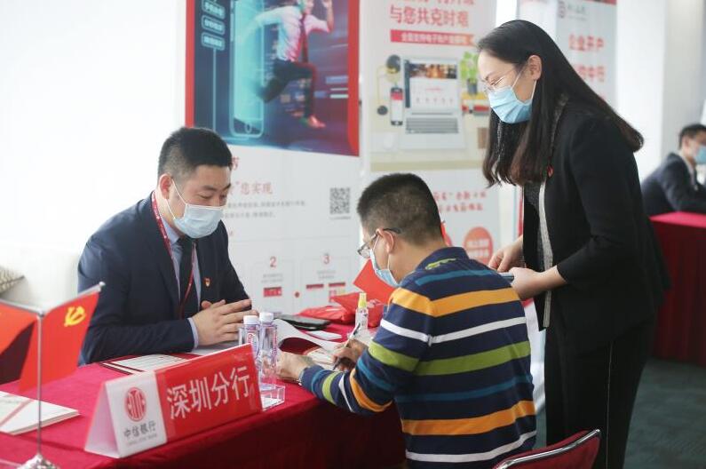 3月13日,在福田区福保街道银企对接活动上,中信银行深圳分行工作人员仔细了解企业融资需求。