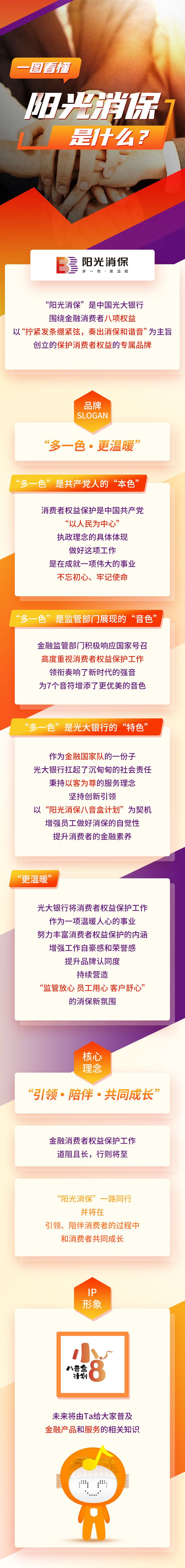 中国光大银行“阳光消保”品牌标识,贯彻了“一个光大”的品牌管理原则,突出了金融消费者权益保护与银行现有业务的依存及拓展关系,在全面贯通现有服务基础上,针对金融消费者权益的“八项基本权益”,向全社会做出了“引领·陪伴·共同成长”的庄严承诺。