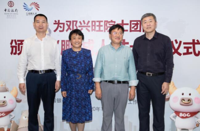 深圳新闻网·见圳客户端2020年11月8日讯 昨日,深圳市光明区委常委、组织部部长绳万青,中国银行深圳市分行副行长韩竹代表深圳市光明区人才办和中国银行深圳市分行,为生物学家、美国国家科学院院士邓兴旺及部分团队成员颁发了“中银鹏城人才卡”钻石卡,这是全市范围内首张向在深院士发放的“中银鹏城人才卡”,标志着这张由光明区人才办和深圳中行共同策划推出的人才卡实现了市级认定的各层级人才全覆盖。邓兴旺院士是深圳市杰出人才获得者、深圳市作物分子设计育种研究院院长、深圳兴旺生物种业有限公司董事长,他带领团队2010年到深圳创业,多年来在水稻领域取得两项重大技术突破,其中“洁田模式”大规模市场示范面积达到50万亩,有效加快了中国农业的轻简化、现代化步伐。