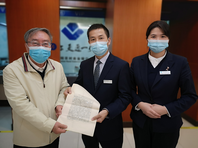李振煌老人把手写的感谢信送到深圳农商行两位员工手中