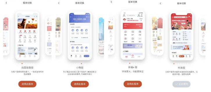 中信银行app可以自行选择最适合自己的版本,除了标准版之外,还有针对出国金融、小微,以及适合老人、军人、海外、私人银行等版本。