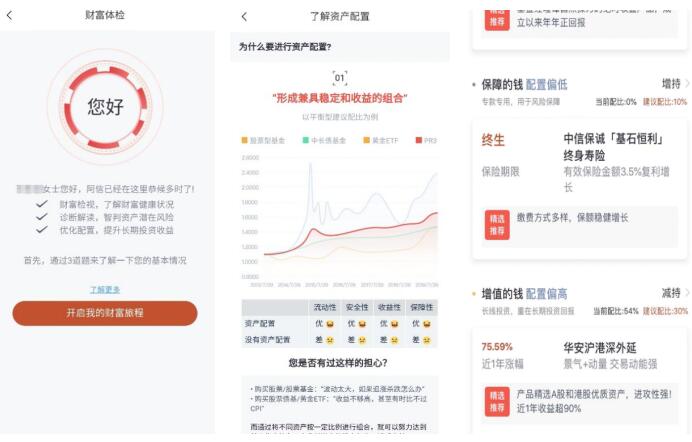 2020年8月,中信银行的app上线了“财富体检”功能。据介绍,这是一套基于历史数据回测构建财富评价的模型,可以基于客户的财富水平、风险偏好以及所处生命周期,动态检视客户财富配置状况,并提供针对性的资产配置建议和产品推荐。