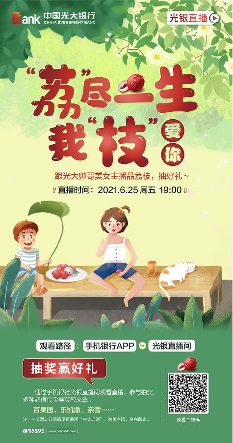深圳新闻网2021年6月25日讯(记者 朱琳)“日啖荔枝三百颗,不辞长作岭南人”“一骑红尘妃子笑,无人知是荔枝来”……时逢盛夏,又是品尝荔枝的最佳时节。6月25日19时,光大银行深圳分行将通过手机银行APP“光银直播”共同开启荔枝品尝之“夜”,并送出精美大奖,爱吃荔枝的你一定不要错过。